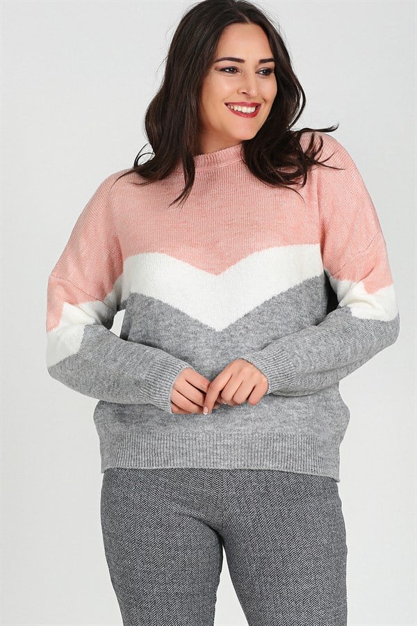 Büyük Beden V Blok Triko Kazak Pudra Gri