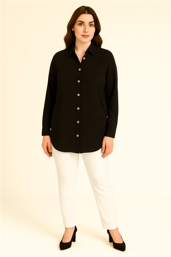 Büyük Beden Yanları Düğmeli Uzun Kol Ayrobin Kumaş Gömlek SiyahCurvy TrendBüyük Beden Yanları Düğmeli Uzun Kol Ayrobin Kumaş Gömlek Siyah